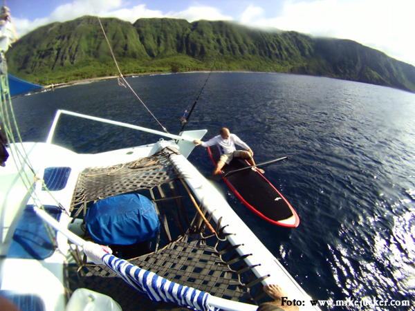 Dem Glück jedoch nicht genug, wir fanden sogar eine Buch mit einer surfbaren Welle. Wir dachten erst es wäre zu klein zum Surfen, schauten uns die Stelle jedoch genau an. Es kam sogar ein Set das man mit einem Shorboard hätte surfen können. Da wir aber solches nicht dabei hatten surften wir halt mit dem 14fuss Überbrett. Wir verbrachten ein paar Stunden dort bis jeder eine Welle hatte. Als Jamie dann wieder am Zug war stellten wir fest, dass das Brett nicht mehr zu steuern war. Er drehte das Brett um, die Finne war weg. Das war schade weil es mit Surfen nun zu ende war. Wir suchten nun das Riff nach der Finne ab. Wie lächerlich zu glauben die jemals wieder zu finden. Das war uns aber egal wir wollten einfach nochmals ein Welle surfen. Aber eben, die Finne war weg. So war es Zeit unsere Sachen unter Deck zu bringen, die Segel hoch zu ziehen und wieder weiter Segeln. Der Wind begann einzusetzen und wir segelten unter Spinacker auf Maui zu. Wir prosteten uns gegenseitig zu mit den letzten Bieren die wir noch hatten und konnten unser Glück kaum fassen.