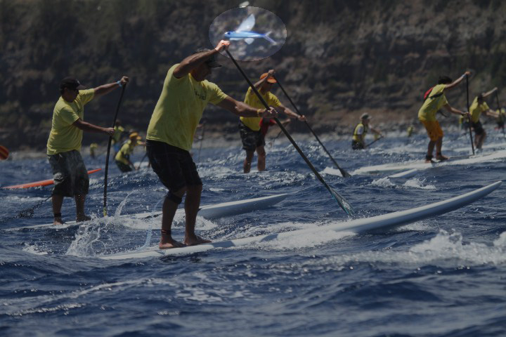 Der Startmoment war dann auch hektisch, eine genaue Startlinie einzuhalten ist auf offener See immer etwas schwierig. Als die grüne Flagge dann hochging hiess es: „The Race is on!“ egal wo man platziert war. Das Feld der Paddler zog sich schnell auseinander: Die Elite mit den grossen und schnellen Brettern weit vorne und die Freizeitpaddler weit hinten. Wer am Malikorun vorne dabei sein will muss die 8 Meilen bei 20kt unter einer Stunde paddeln. Dazu braucht es viel Muskelkraft, gute Wasserkenntnisse und ein Brett gegen die 17Fuss oder mehr.