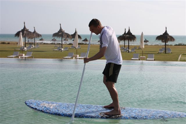 Der Tag begann verheißungsvoll. Kein Wind, moderate Wellen, schönes Wetter. Nach dem Frühstück gleich die Boards vom Pool an den aufgeschütteten Sandstrand und rauf aufs Wasser. Das Meer zeigte sich von seiner ruhigen Seite auch wenn die Wellen mitunter noch kräftig waren. Mit den ersten unerschrockenen Spielerfrauen gingen wir raus. Ich half beim Ein- und Ausstieg und alle kamen ohne Probleme zurecht. Ich paddelte ein Stück weiter raus und versuchte noch ein paar Wellen abzureiten aber leider hatten die Wellen an der äußeren Sandbank keine ausreichende Höhe. An einer Landspitze ging es besser und ich paddelte ein paar kleine Wellen. Oliver Bierhoff kam dazu und gemeinsam paddelten wir einige Wellen an. Das Wasser war flach und die Wellen recht chaotisch, trotzdem konnte jeder ein paar Ritte verbuchen. Nach dem Mittagessen wurde es wieder windig und ein Versuch von mir zeigte, dass es mit Einsteigern hier keinen Sinn mehr macht. Also die Boards wieder zurück zum Pool. Es kamen noch 2 vom Trainerstab zum paddeln und machten ihre Sache gut. Dann kam Lukas Podolski. Ich überredete ihn es auch zu versuchen und zack stand er auf dem Board. Gut. Er ist kein Wassersportler und nach kurzer Weile tauscht der die trockene Umgebung des Boards mit dem kühlen Nass. Aber Lukas ist ehrgeizig und probierte es noch eine ganze Zeit. Er bekam mehr Kontrolle aber schaffte es trotzdem noch mal in den Pool. Danach wollte er schnell unter die heisse Dusche und verschwand mit seinem Golfmobil. Der nächste Superstar, Cacao, machte es besser. Vielleicht lag es daran, dass er kaum schwimmen kann und deswegen nicht ins Wasser wollte, jedenfalls stand er sehr locker drauf und fuhr mit mir eine ganze Zeit ohne reinzufallen. Für morgen haben wir an einem anderen Strand einen SUP Termin mit den Journalisten geplant. Es sind insgesamt 90 Journalisten hier, mal schauen ob sich einer für SUP begeistern kann. Hoffentlich spielt auch das Wetter mit. Das Abendessen war gewohnt extrem gut. Den DFB Jungs fehlt es an nichts. Das ist alles mal so richtig lecker und man muss aufpassen dass man hier nicht 15kg zunimmt. An der Kofferfront gibt es leider nichts Neues.