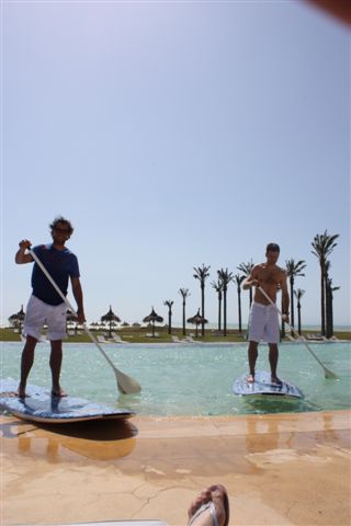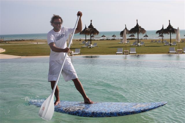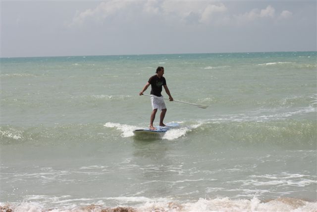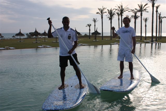 „Ich trainiere die Fußballstars der Deutschen Fußballnationalmannschaft in ihrem Trainingslager auf Sizilien in Stand up Paddling kurz bevor es zur WM in Südafrika geht“. Das war ein Gedanke, den ich erstmal verarbeiten musste. Heute, rund 6 Wochen später liege ich auf Sizilien auf meinem Hotelbett und ordne meine Gedanken. Die Anreise war ein wenig geprägt von Zeitdruck und bösen Überraschungen aber auch mit Freude und großen Augen. Der Reihe nach. Los ging es am Sonntagabend in Pelzerhaken. Das Surf Festival hatte seine Pforten geschlossen, das Material war im und auf dem Bus und ich machte mich auf die gut 850 km nach München. Dort angekommen reichte die Zeit für einen knappen Powernapp, packen und einen kurzen Sprung ins Büro, T-Shirts und Lycras einsammeln. Endlich am Flughafen angekommen, der Aschewolke des Ejakualaschiessmichtotwiederheist-Vulkan knapp entronnen machten wir, meine Frau Ina, meine Tochter Leilani und ich endlich Bekanntschaft mit der feurigen Vulkaninsel Sizilien. Leider entpuppte sich die Fluggesellschaft als ebenso heiße Luftblase und die veralteten Maschinen wurden nur durch die unglaubliche Leistung, alle Gepäckstücke verloren zu haben, übertroffen. Zum Glück hatte ich Boards und Paddel separat ins Hotel schicken lassen. Nach einigem hin und her verließen wir nur mit Handgepäck den Flughafen, holten den Mietwagen und machten uns auf die rund 130km Reise zum Hotel der DFB Auswahl in der wir auch nächtigen durften. In Sciacca ( spricht sich Shaka, kein Witz ) deckten wir uns mit den nötigsten Sachen wie Zahnbürste und einigen Klamotten aus und schafften es endlich gegen neun das Hotel zu erreichen. Das ich mit den Fußballstars nicht in einer Frühstückspension absteigen würde wusste ich bereits, Internet sei dank. Das Zimmer hier in dem ich gerade schreibe während meine Frau unsere Tochter ins Bett bringt, ist aber doch noch ein paar Nummern größer als erwartet. Himmelbett, begehbarer Kleiderschrank, Bad in der Größe einer 2 Zimmerwohnung und und und. Die Aussicht kenne ich noch nicht, sind zu spät angekommen, wird aber auch nicht schlecht sein. Morgen um 9 treffe ich mich mit Georg Behlau vom DFB zum Frühstück, dann bekomme ich den Fahrplan für die nächsten Tage. So, ich hau mich aufs Ohr, ich habe fertig.