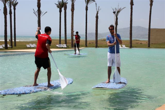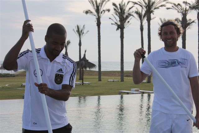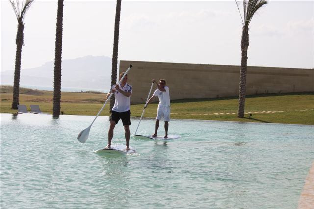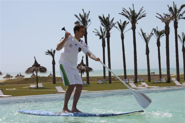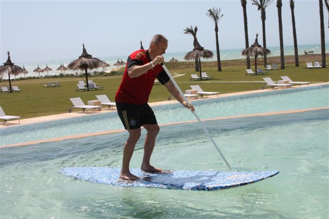 ( 5 Anfängerboards ) half mir. Nachdem die Boards fertig waren ging ich aufs Wasser. Meine neue Jeansshorts war zwar nicht stylegerecht aber ich hatte ja nichts anderes. Der Wind blies mit ca.20 Knoten voll auflandig und die kurzen Wellen machten es tricky raus zu kommen. Alles klar dachte ich, kein Wetter um SUP Anfänger hier zu schulen. Also die Boards zum Pool und erstmal aufs Zimmer, umziehen. Beim Mittagessen stellte Oliver Bierhof uns vor und erklärte auch, dass heute die SUP Demo um halb drei stattfinden würde. So fand ich mich zu der Uhrzeit am Pool wieder und erklärte einem Teil des Trainerstabs und einigen Spielerfrauen wie SUP funktioniert. Dafür dass es ein Pool war und somit die Möglichkeiten begrenzt machten alle ihre Sache gut. Ich hatte den Whopper von Starboard dabei der gerade bei Einsteigern extrem beliebt ist. Hansi Flick war sicherlich der Fleißigste wenn es darum ging Kollegen ins Wasser zu schubsen. Nach einer guten Stunde beendeten wir die SUP Einführung für diesen Tag und ich konnte mit meinem neuen Freund Francesco noch eine Runde Windsurfen gehen.