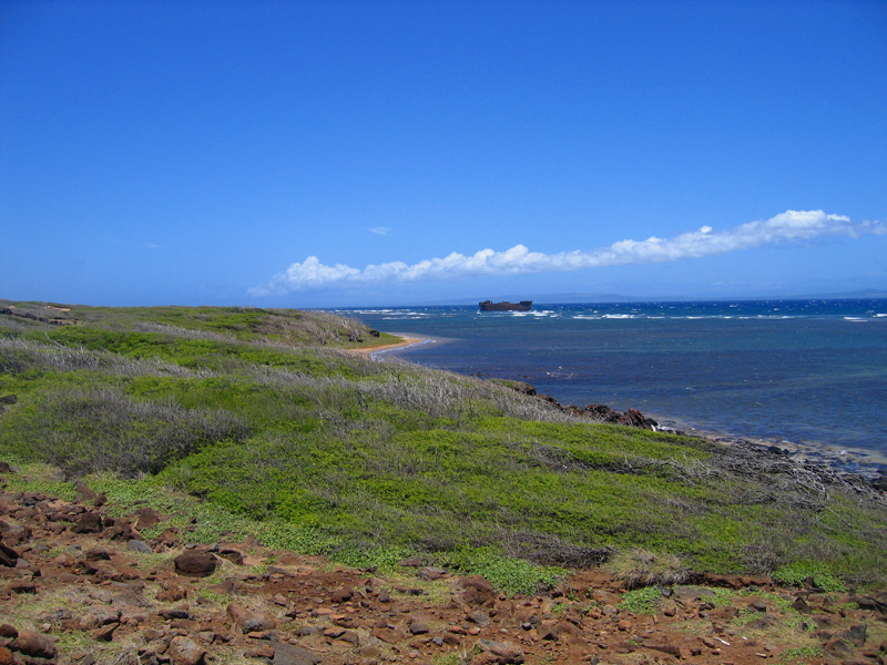 Am Morgen segelten wir mit gut 20kt Wind im Rücken vom Luv der Insel in Richtung Lee der Insel. Der Segeltörn dorthin führte entlang der „Shipwrecks Coast“ (Schiffswrackküste). An diesem 30km langen Küstenabschnitt Lana’is wird so ziemlich alles an Abfall angespült, was das Meer, geschweige denn der Mensch, her zu geben hat. Bei 20 bis 30 Knoten „on shore“ Winden 350 Tage im Jahr, ist das auch kein Wunder. Die windverblasenen Strände dort sind einsam und unberührt, fernab von der Zivilisation.