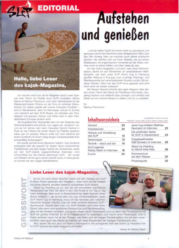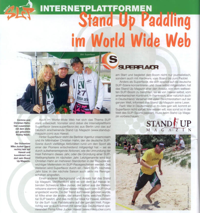 Im vierzigseitigen World of SUP Special wird neben superflavor auch das StandUpMagazin vorgestellt. Das Kajak-Magazin hat den Trend erkannt und holte sich Markus Perrevoort, Surfski und Stand Up Paddler, als Editor für den SUP-Special. Makrus hatte auch die Gelegenheit sich mit Robby Naish zu unterhalten welcher sich im Vorwort persönlich an alle Kajakpaddler wendete.