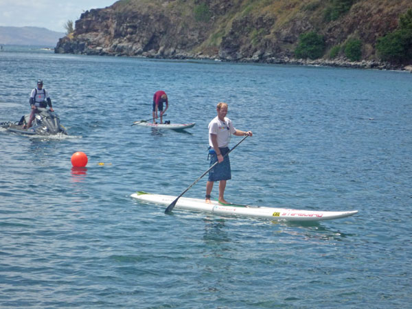 Connor Baxter gewann dann auch das zweite Rennen der Maui Jim Triple Crown of Stand Up Paddle, Eine Minute 8 Sekunden vor Kaeo Abbey aus O’ahu. Livo Menelau der zweite des ersten Rennens, der „Handsome Bugga Poi Bowl“ wurde dritter mit einer Zeit von 3:27:26.