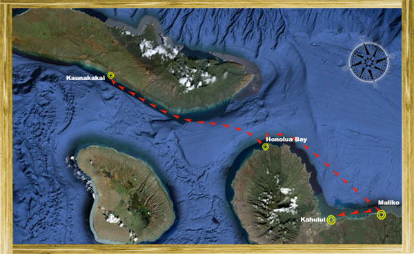 Die Königsstrecke war aber ganz klar die von Maui nach Molokai. Die 27Meilen führen durch den Pailolo und den Kalohi Kanal zwischen Maui, Molokai und Lanai. Die Winde in diesem Meeresengen sind sehr stark was ebenfalls zu einem starken Seegang führt. Somit war also viel Spass für die Kontrahenten vorprogrammiert. Die Kunst bei Downwinder-Paddelrennen liegt darin, so viele „Glides“ wie möglich zu erwischen d.h. die Paddler surfen so viele Wellen auf dem offenen Meer wie es nur geht. Auf einer guten Downwinderstrecke erreichen die Toppaddler bis zu 9 Knoten (14.4kmh) Paddler wie Connor Baxter und Dave Kalma halten solche Geschwindigkeiten auch über 3 Stunden (siehe Resultate).