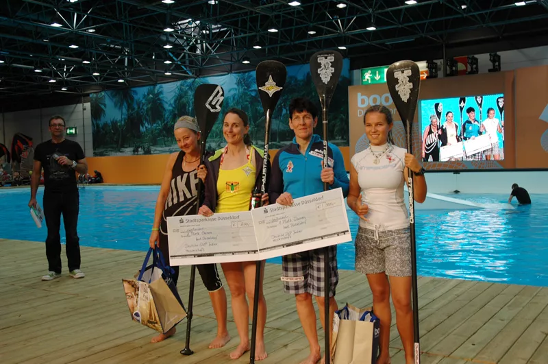 Bei den Frauen war das Feld deutlich kleiner und alle vier Mitstreiterinnen hatten eine gute Chance auf den Titel am Becken an der beachworld. Im kleinen Final zwischen Petra Offemanns und Noelani Sach, hatte dann Noelani Sach die Nase vorne und wurde Dritte. Im Final zwischen Sonja Duscheck und Beate Bolg, zweit platzierte der NP 4-Seen Trophy, konnte Beate Bolg dank höherer Paddelkadenz die Strecke dann vor Sonja Duschek beenden und wurde somit Meisterin an der ersten Deutschen Indoor SUP Meiserschaft.