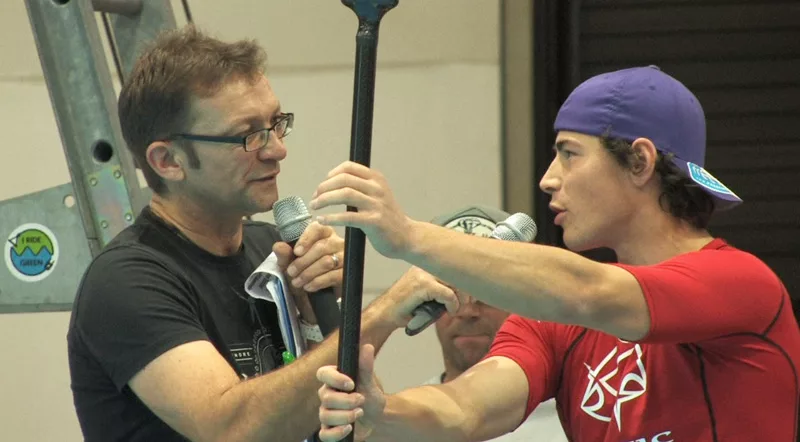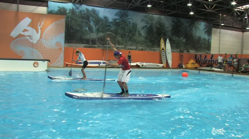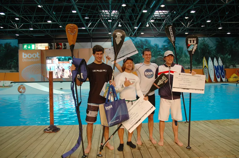 Am Rennen im Pool kam es dann jedoch etwas anders als erwartet: Carsten Kurmis erwischte im Halbfinal an der zweiten Boje einen zu grossen Radius und kam zu nahe an den Beckenrand und konnte so nicht ins Finale einziehen. Er wurde im kleinen Finale dann aber dritter. Für eine Überraschung sorgte auch Ole Schwarz (Sohn von Olaf Schwarz) welcher sich mit einer Wildcard für das Rennen qualifizierte und den respektablen fünften Platz belegte. Der klare Sieger war aber Normen Weber welcher seine Erfahrungen als Wildwasser Kanadierpaddler sehr gut auf dem SUP umsetzen konnte und auch an den Wendebojen immer der Schnellste war. Er unterbot im Finallauf dann auch noch seine eigene Bestzeit und gewann das Rennen mit einer Zeit von 40:98 Sekunden.