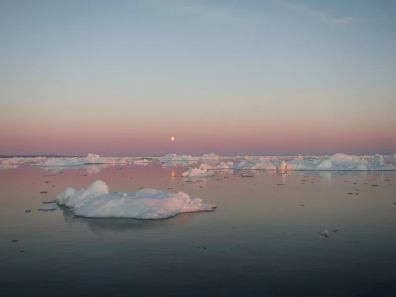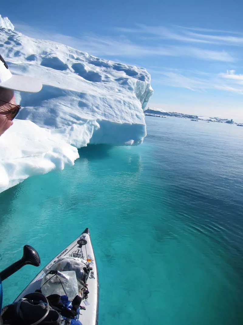 Most fishermen, who had never seen a Stand up paddleboard before, were watching, when I made my first paddles strokes out of the Ilulissat’s little fishing harbor. They had been very shy and didn’t ask many questions, looked at me and smiled when I was still preparing to leave. I was packed with food and water for 8 days, safety gear, navigation equipment, my ‘sup bed’ and plenty of warm clothes. I was using a 16’ Starboard inflatable, which had been easy to get on the plane with me all the way from Maui and change the way we can explore, now almost any destination you can go and use a SUP. Today was a perfect arctic day with blue skies and fresh but decent temperatures. In front of me was a 15-mile field of ice and icebergs. Ilulissat, which means Iceberg in Greenlandic is situated next to the most producing glacier in the Northern hemisphere. 50 meters a day and 20 billion tons every year calve of the glacier and I was paddling right between those icebergs. Ice was everywhere. I had to work hard to find a way through it. On windy days this would be a very dangerous task, and a big risk of being crushed by the ever-moving ice.