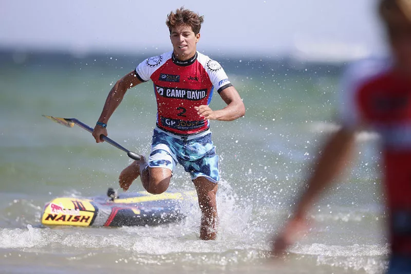 Sitting in second through the first 3 legs of the sprint, Kai made his move in the closing seconds of the final lap to the beach, managing to share a bump with Connor as the two surfed their way towards the shoreline.