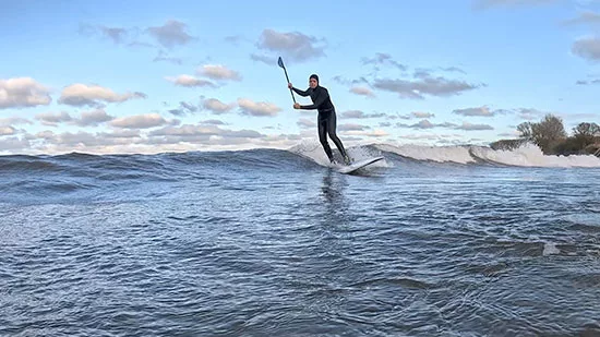 SUP Surfing geht immer. Andy bei sich in Kiel an einem Secretspot – Micro Wave Surfing nennt sich das, der Spass aber maximal.